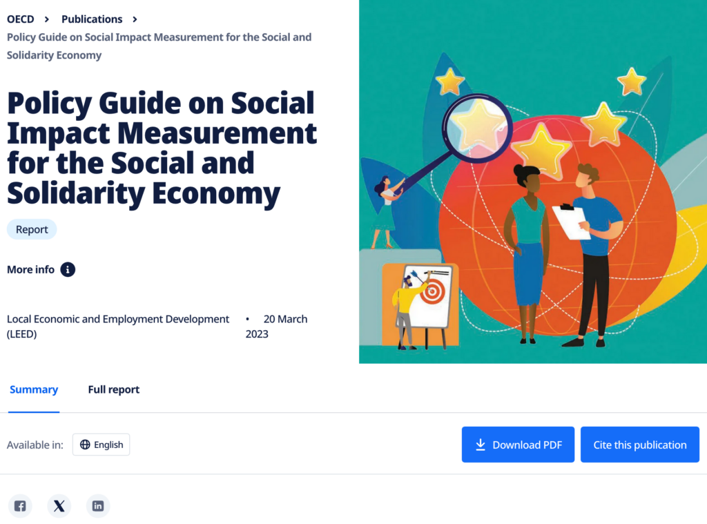 Social impact measurement can help organisations understand the added. value generated by their activities, in the pursuit of their mission and beyond. Drawing on a mapping exercise and good practice examples from over 33 countries, this international policy guide navigates how policy makers can support social impact measurement for the social and solidarity economy by: (i) improving the policy framework, (ii) delivering guidance, (iii) building evidence and (iv) supporting capacity.